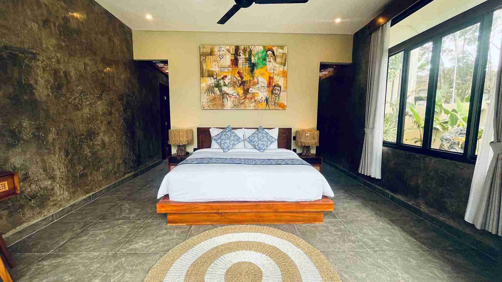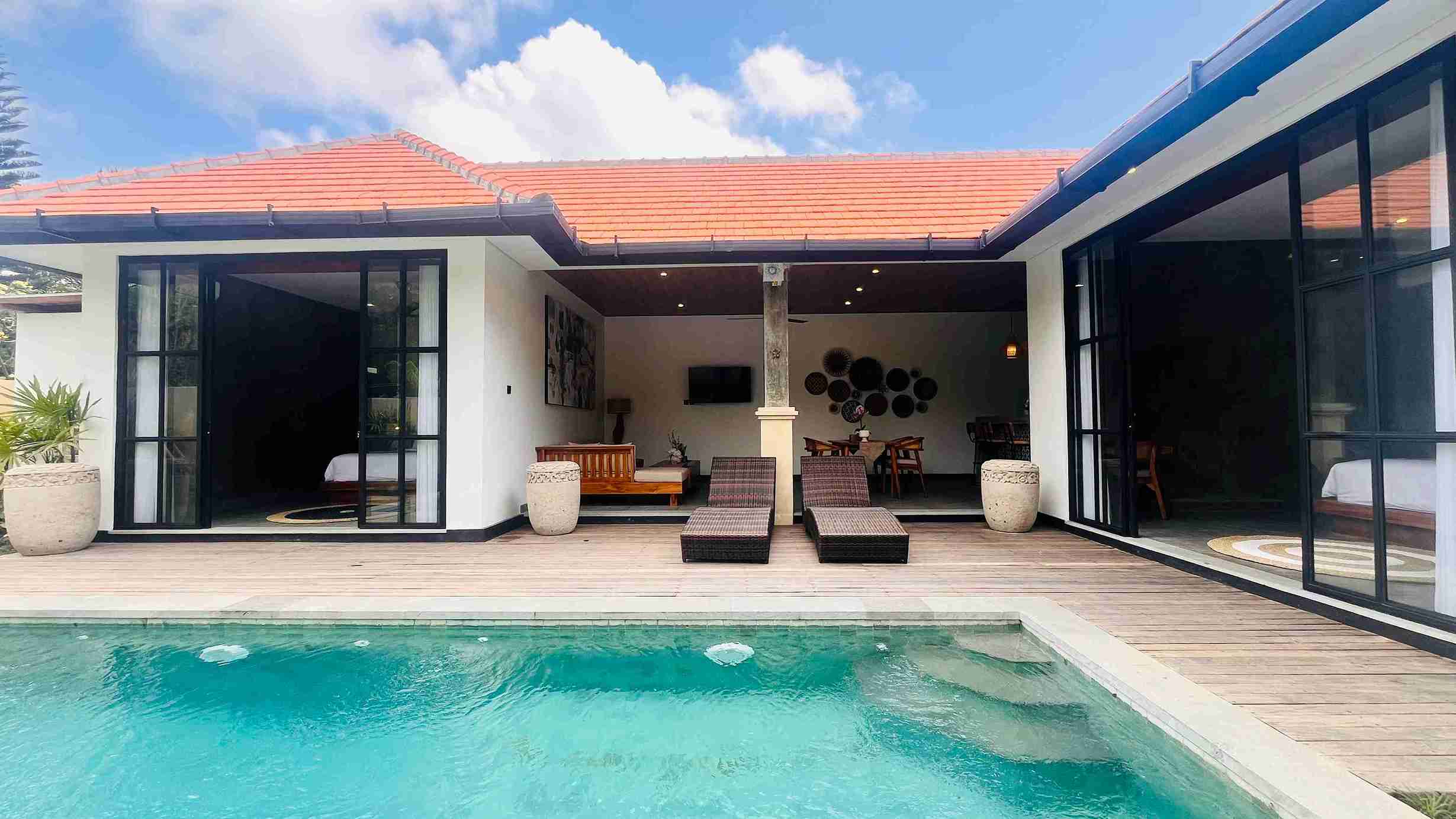 Designed with clean lines and polished cement finishes, the villa offers a minimalist yet warm atmosphere that’s both trendy and tranquil. The open-plan living and dining area flows seamlessly to the outdoor space,